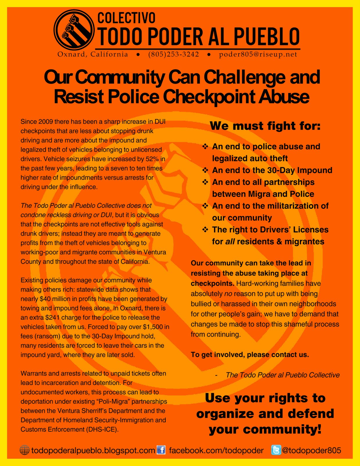 The Todo Poder al Pueblo Collective does not condone reckless driving or DUI, but it is obvious that the checkpoints are not effective tools against drunk drivers; instead they are meant to generate profits from the theft of vehicles belonging to working-poor and migrante communities in Ventura County and throughout the state of California.