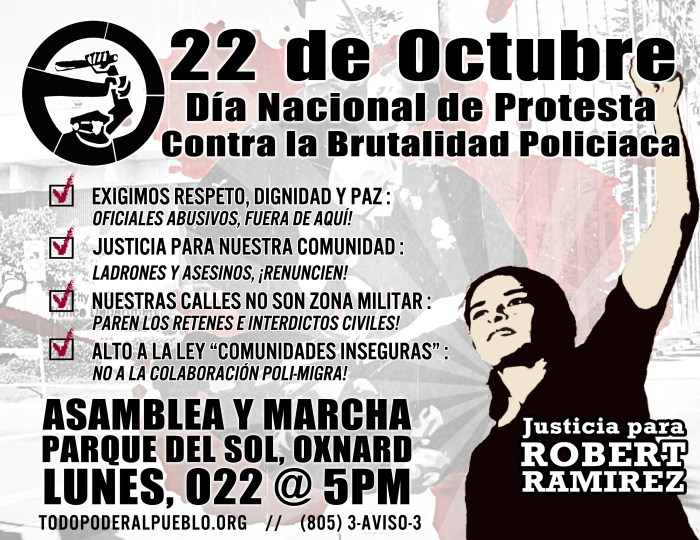 Con la lucha de los residentes de Oxnard para obtener justicia para las víctimas de la brutalidad policial, como Robert Ramirez que finalmente se ha logrado reconocer, el Colectivo Todo Poder al Pueblo orgullosamente marca el primer 22 de octubre como Protesta en Oxnard y la región del Condado de Ventura.