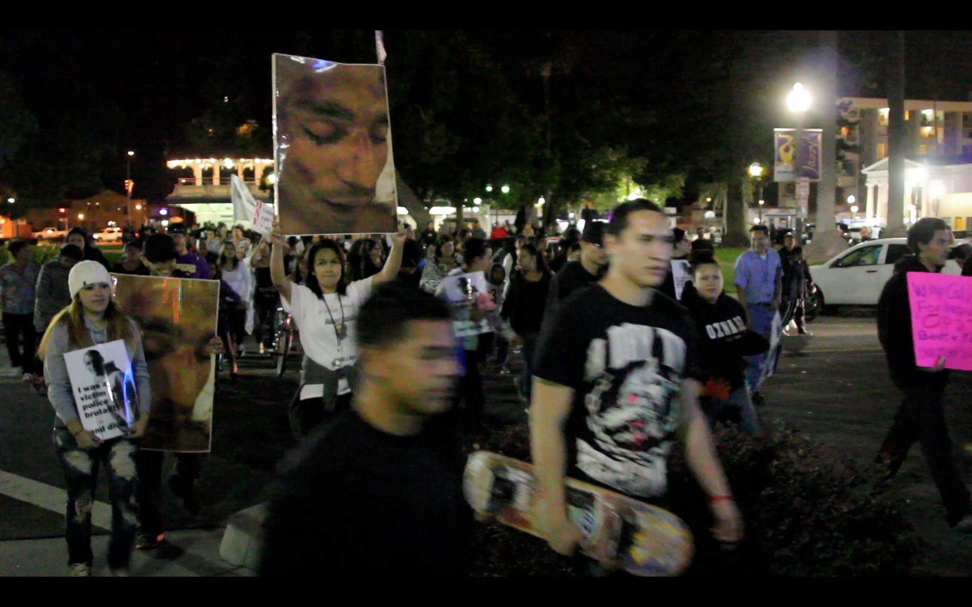 In front of police headquarters, protesters grabbed large pieces of chalk and wrote messages on the sidewalks such as, “Stop the police killing.” A woman wrote, “R.I.P. Robert Ramirez.”