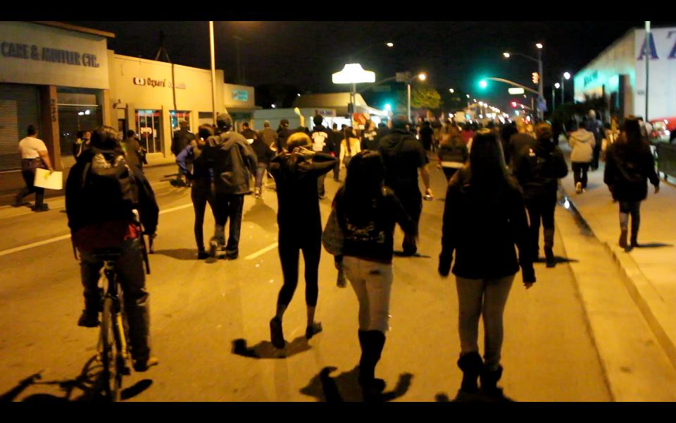 Once protesters arrived at police headquarters, they briefly broke off into two groups. One group stayed in front of the station, shouting “killer cops off our streets.” Another group briefly went to the back of the building, where helmeted police had been gathered minutes before. By the time protesters arrived in back, the police had gone inside the building or left in their squad cars.