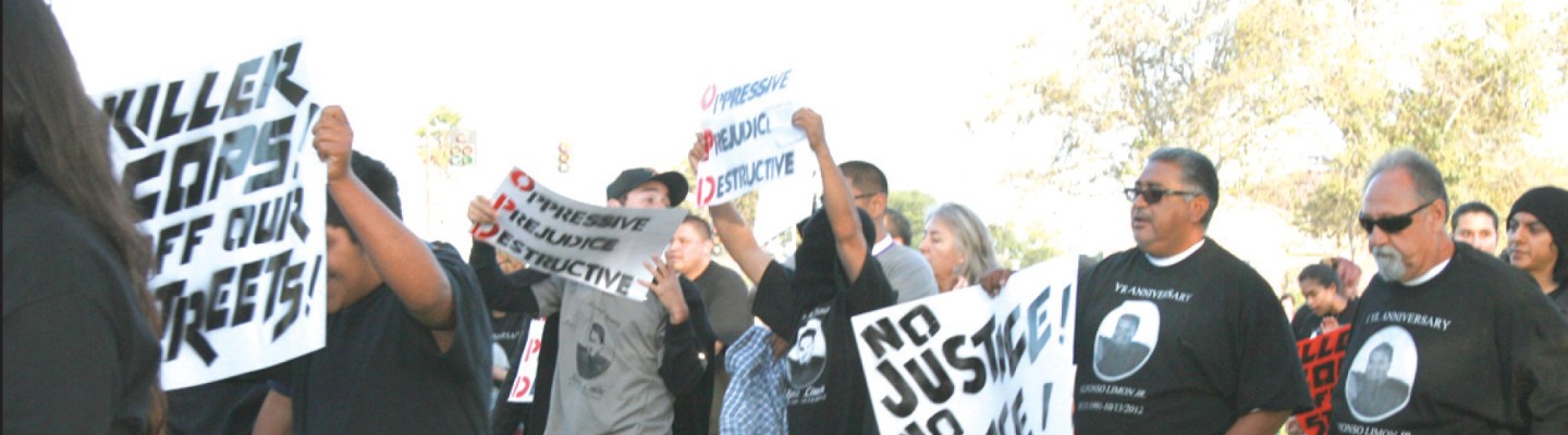 Protestantes en contra de la violencia policiaca marcharon el domingo pasado por las calles de la ciudad de Oxnard para recordar el primer aniversario de la muerte de Alfonso Limón Jr., un joven que murió a manos de agentes de la policía.