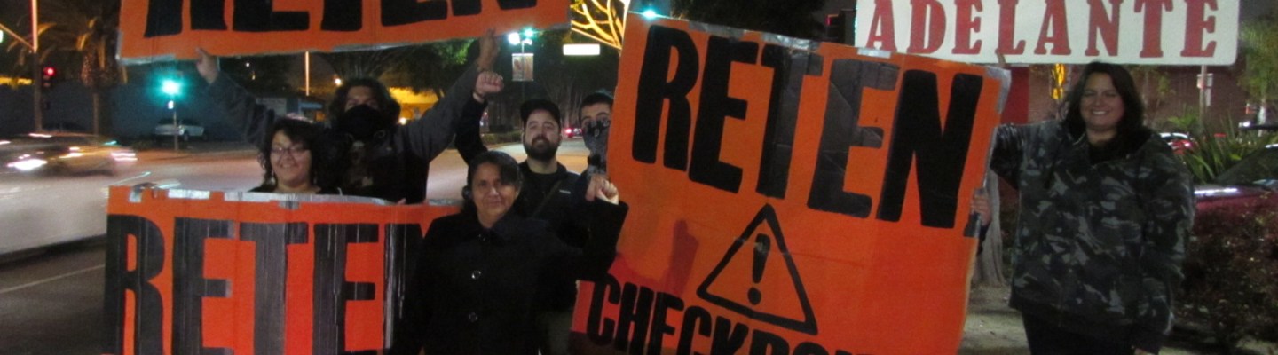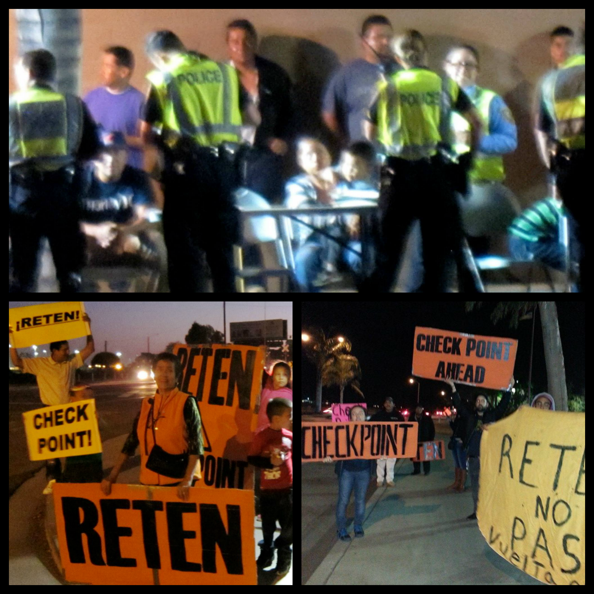 Yesterday they placed the checkpoint strategically on a busy yet inconspicuous and poorly lit street, with nowhere to exit once you enter the checkpoint line. We divided ourselves into three groups, one block before and alongside two driveways adjacent to a parking lot. We took over the sidewalk holding our banners, waving our lights, and using our voices to yell, “Checkpoint! Checkpoint! Turn here!”