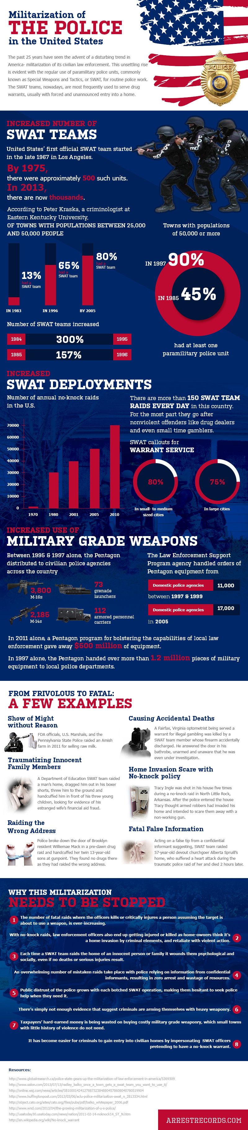 04/10/2014 by Colectivo Todo Poder al Pueblo In numbers: How the civilian police have become a militarized force in the U.S. INFOGRAPHIC: The Militarization of Domestic Police in the United States SOURCE: http://blog.arrestrecords.com/infographic-the-militarization-of-our-police-forces/ Share this: Click to email a link to a friend (Opens in new window) Email Click to print (Opens in new window) Print TweetShare on TumblrLike Loading... Related