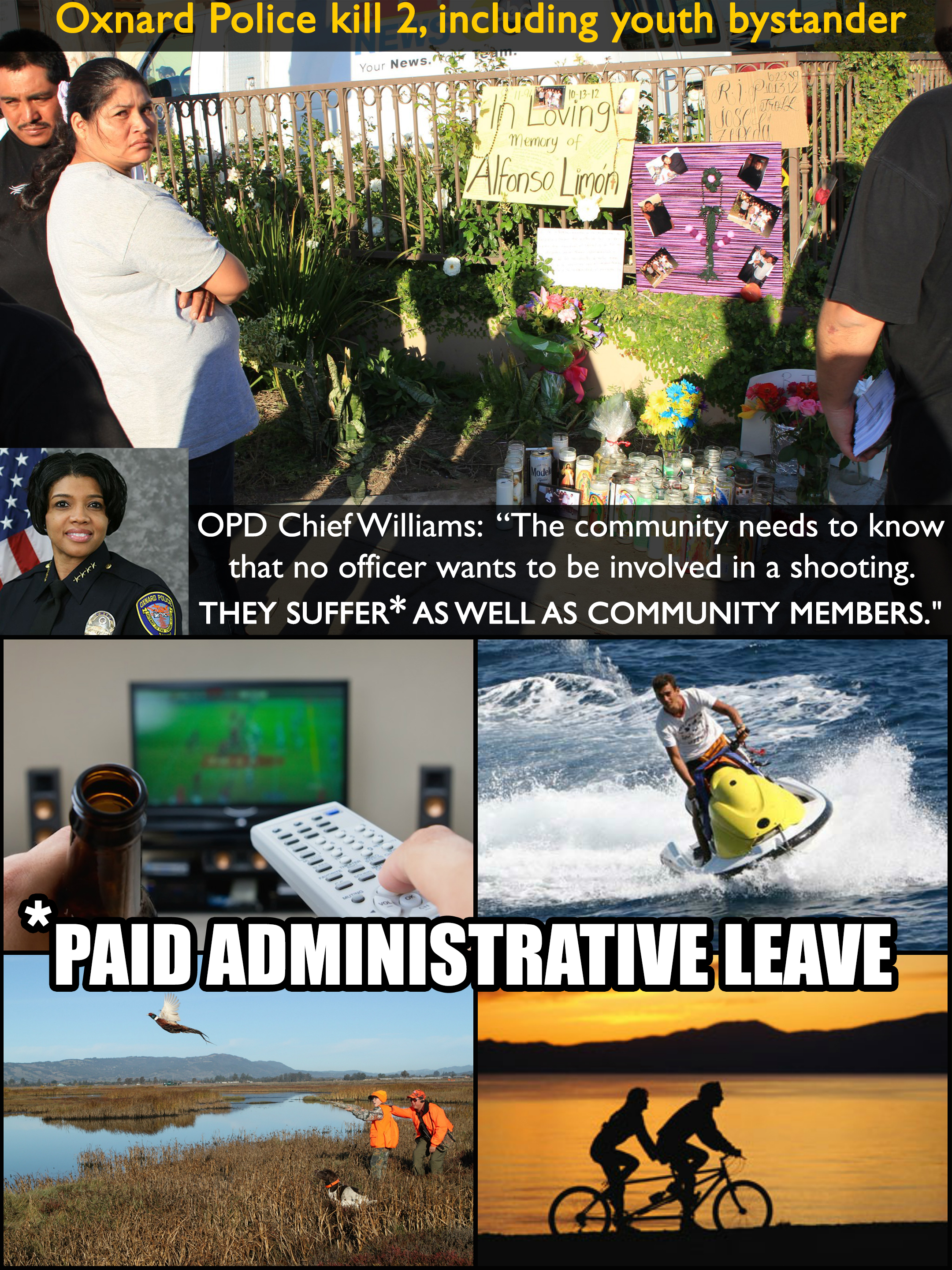 “When critical incidents happen, community members may not want to listen to anyone in the quote-unquote establishment… The community needs to know that no officer wants to be involved in a shooting. THEY SUFFER AS WELL AS COMMUNITY MEMBERS.” – Oxnard Police Department Chief Jeri Williams speaks to The Monterey County Herald, 5/27/14