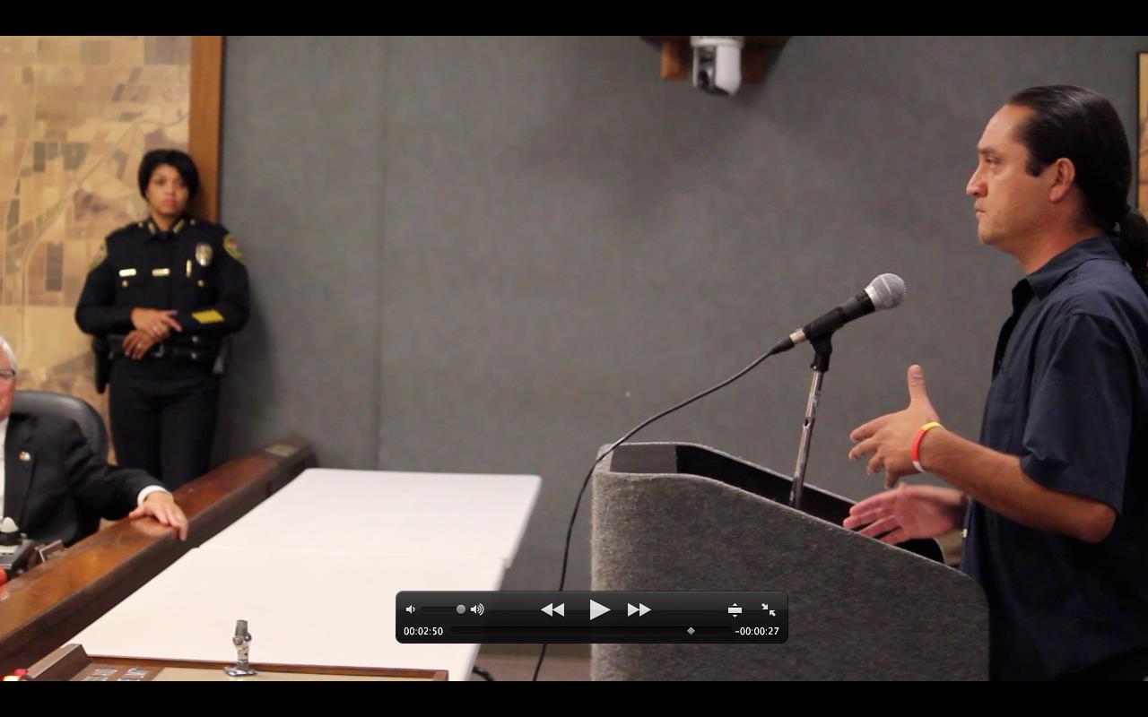 Romero addresses the Oxnard City Council on Sept. 11, 2012 as Chief of Police Jeri Williams watches. For years Romero, one of many active members of the Todo Poder al Pueblo Collective and organizations such as Union del Barrio, has earned a reputation in the eyes of the people as an outspoken & strong community advocate. (CTPaP MEDIA OPERATIONS)
