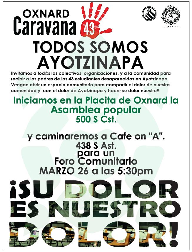 What: Parents and supporters of the 43 Ayotzinapa students from Iguala, Guerrero, Mexico will be visiting Oxnard on March 26, 2015. Oxnard marks one of many visits in a major solidarity tour by the Caravana 43, which is taking the parents to various communities across the United States. Oxnard’s events will begin at Plaza Park on 500 C st. with a traditional Aztec dance ceremony at 5:30pm. This will be followed by a free community forum that will be held a block away at the Café on A / Acuña Gallery and Cultural Center at 6:00 pm, which will discuss the violent policies of the governments of Mexico and the United States, the need for solidarity, and the continued importance of local community organizing,