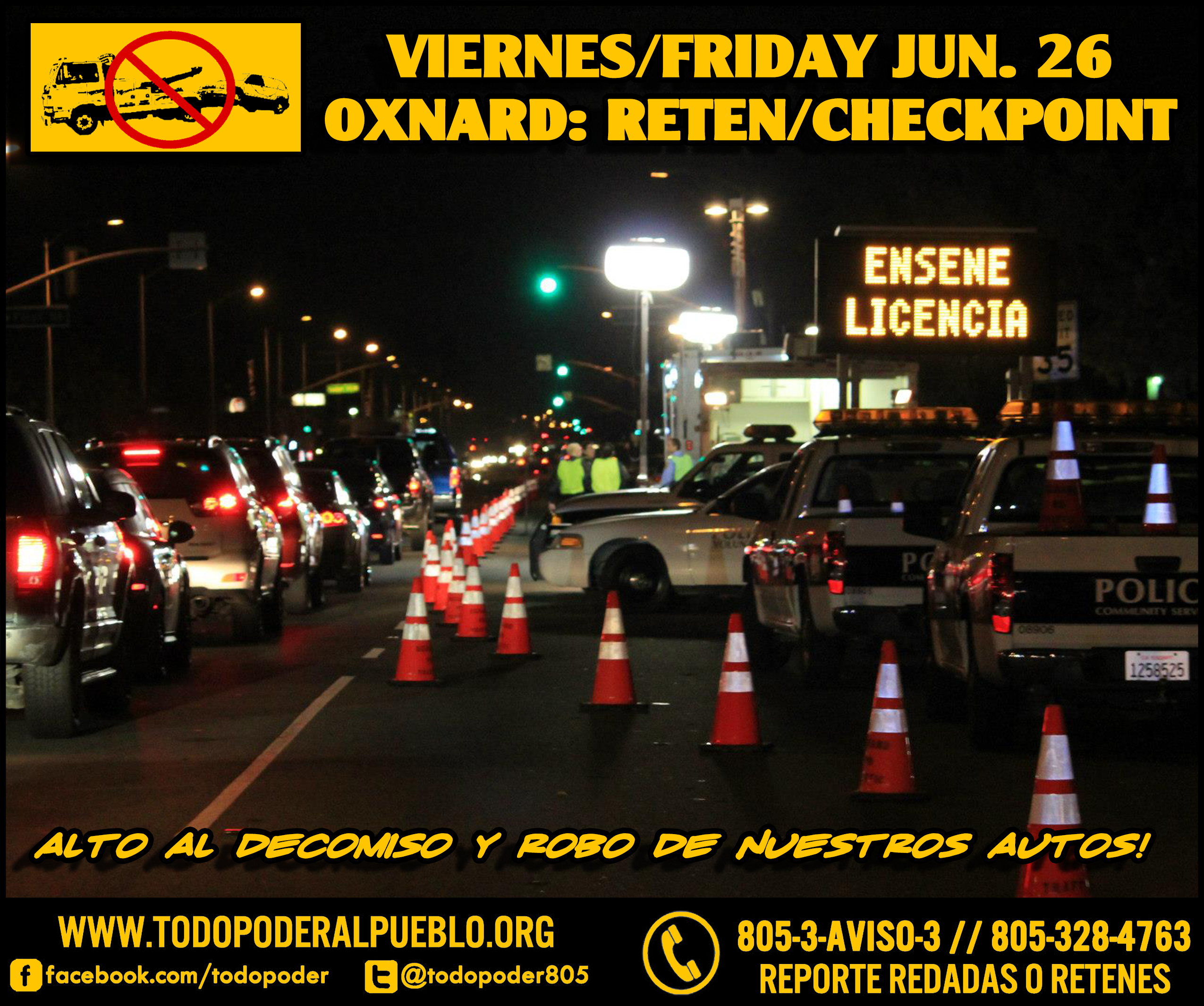 We believe that our community must resist the drivers’ license checkpoints where cars are confiscated from families who haven’t been able to acquire valid driver’s licenses yet. These confiscations have led to our most vulnerable neighbors in the community being put at risk of being caught up in the system, and subject to court appearances, fees, and trouble with the law. Please inform Todo Poder al Pueblo of any abuses at the checkpoints, and to spread the word to your friends and family to prevent more families from paying these heavy traffic tickets. As always, if you have been drinking make sure to have a designated driver!