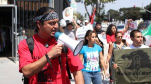 Above: Gerardo Limon, who narrowly avoided death at the hands of OPD, stands with placards of his dead brother at the site of Alfonso’s death during a family press conference, 6/11/14